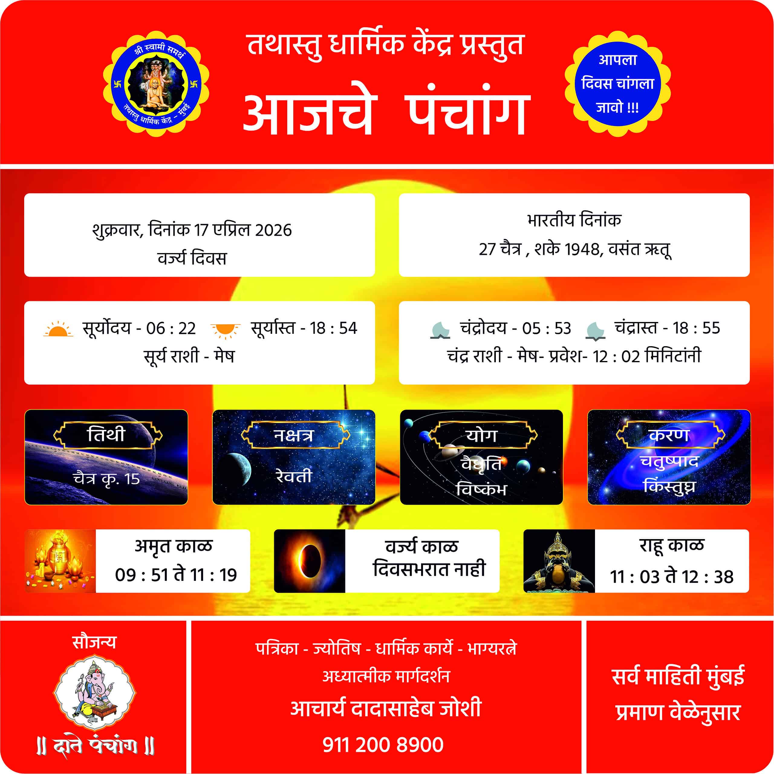 शुक्रवार, दिनांक 17 एप्रिल 2026 पंचांग by तन्वी दि. 17 । एप्रिल । 2026 आज दिनांक, आजचे पंचांग दि. 17दि. 18 । एप्रिल । 2026 21,649 वेळा पाहिलं पुढील बातमी सोयाबीन उत्पादक शेतकऱ्यांना दिलासा दि. 17 । एप्रिल । 2026 मागील बातमी भारत - ऑस्ट्रियामध्ये द्विपक्षीय चर्चा दि. 16 । एप्रिल । 2026